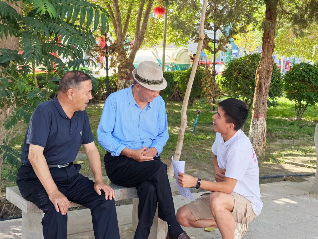 实践队员也有幸采访到了一位1996年从河南来到新疆屯垦戍边的建设兵团退休老兵徐如义,他向实践队员讲述了建设新疆的历史故事,从荒漠戈壁到如今的高楼林立,从手动劳作一人最多种几亩地到如今的机械化生产一人可以管上几十亩地……几十年里,新疆经济在党的坚强领导下、在习近平新时代中国特色社会主义思想指引下快速发展,基础设施建设不断完善,人民生活也发生了翻天覆地的变化,幸福指数不断攀升。采访结束后,徐爷爷深切寄语实践队员,鼓励广大青年好好学习、报效祖国。