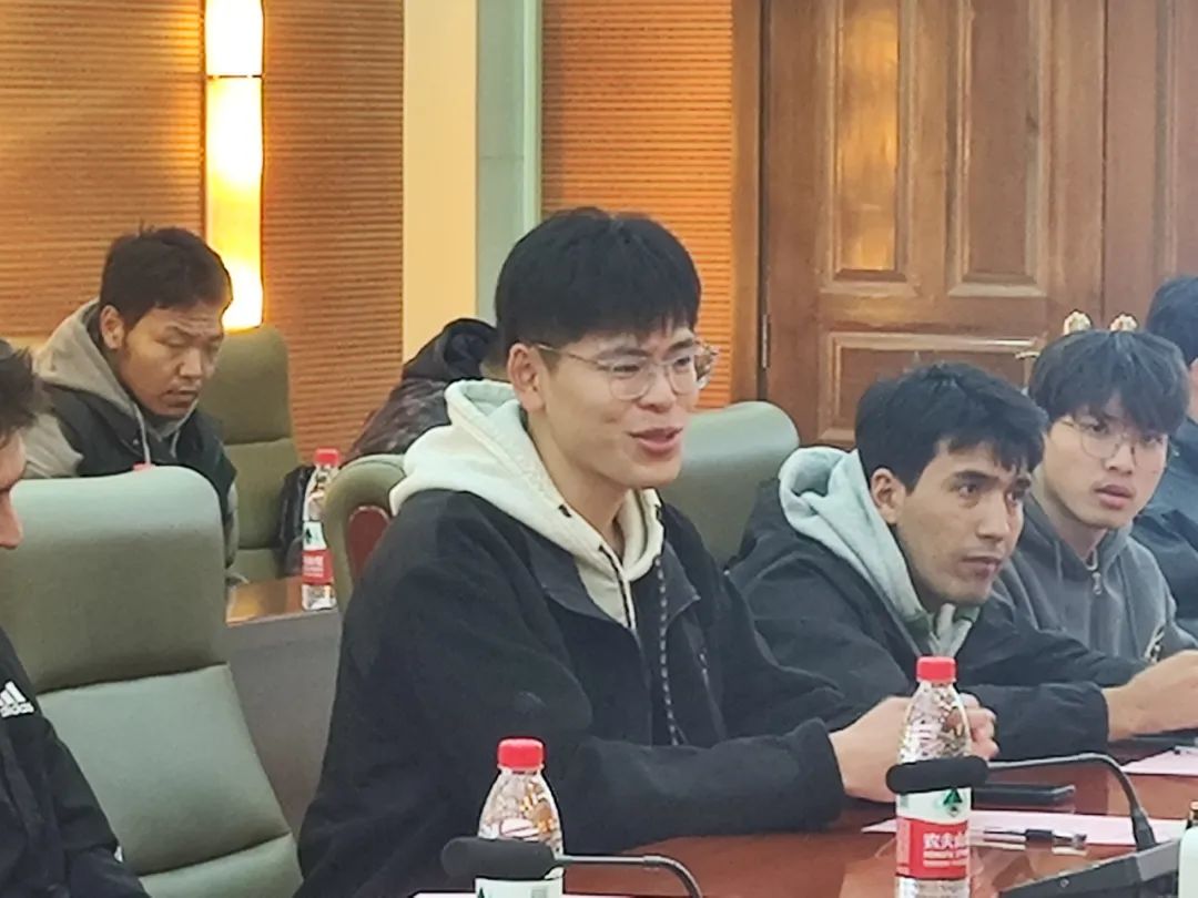 座谈交流环节,2020级推免学生苏晓成向低年级同学分享了自己的学习生活经验。苏晓成同学介绍了自己保研推免的心路历程以及如何与舍友友好相处,建议同学们坚定学习目标,不要轻言放弃。2021级的霍加恩别克·海拉提别克同学分享了他选择投身军旅的原因以及这段经历如何塑造了他。他深感在部队中接受的锻炼对他产生了深远的影响,不仅增强了他的身体素质,还提高了他的自律能力,并帮助他形成了良好的团队合作精神。2021级“博雅之星”获得者韦森同学则分享了在大学生艺术团的工作经历,他鼓励民族学生要充分发挥自身优势,积极参与文化艺术活动,在参与中找寻热爱。座谈会在轻松愉快的氛围中逐渐向好。随后,民族学生依次发言,畅谈入学以来的成长进步、收获感想,对学院老师和同学们提供的帮助和关爱表达了诚挚的感谢,与会老师认真聆听同学们的发言,尽心解答他们在学习和生活上的困惑。