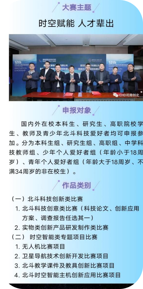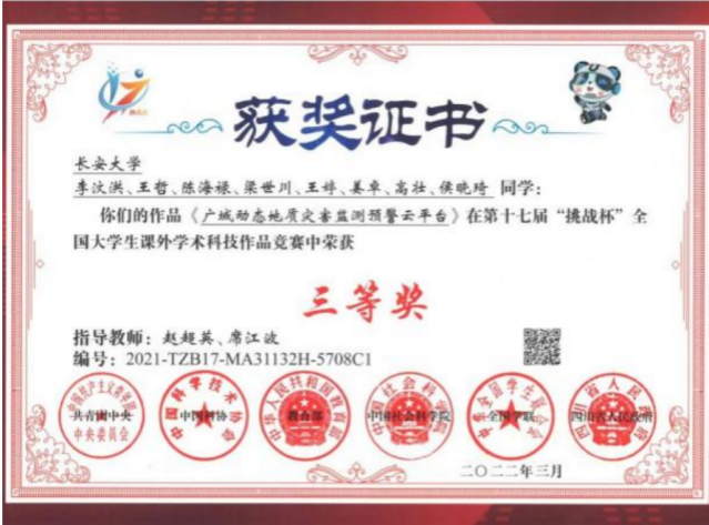 景策等同学的作品《无人机投放式北斗滑坡监测预警系统》获“星系”级作品(特等奖)。在第十一届“挑战杯”陕汽集团陕西省大学生创业计划竞赛中获得金奖、银奖各1项;在第十三届“挑战杯”中国大学生创业竞赛决赛中,《“北斗地哨”——地质灾害隐患识别与监测预警响应系统团队》的作品团队荣获三等奖。