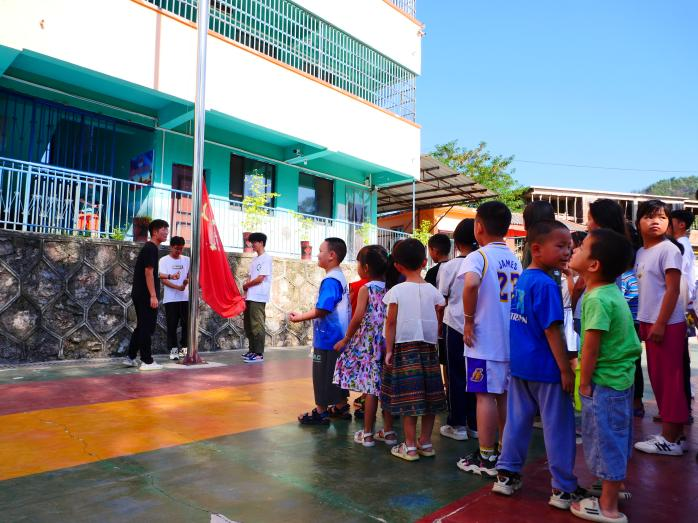 筑梦黔行队队员护送着鲜艳的五星红旗,他们目光如炬,队列整齐,步履铿锵。在庄严的国歌声中,五星红旗冉冉升起。队列中,每一位孩子深怀对祖国无限的热爱和崇高的敬意行队礼、高声唱响国歌,伴随着雄壮嘹亮的国歌声,全体队员与孩子们正式开启暑期支教课程。