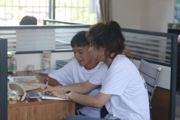 筑梦黔行队为南江村初、高中生公益性辅导相关课程,鼓励山村孩子前来自习,使用“随叫随到、随问随答”的体系助力每一个山村青少年追逐自己的梦想。在辅导过程中,团队队员认真解答每一道题目,选择易理解、最简便的方法进行讲解,在同学们的反馈声中一致称赞。