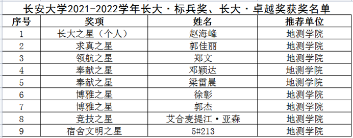 优秀共青团员,军训先进个人,社会实践先进个人,社会实践先进团队,社会实践优秀成果等奖项称号总计二十余项。