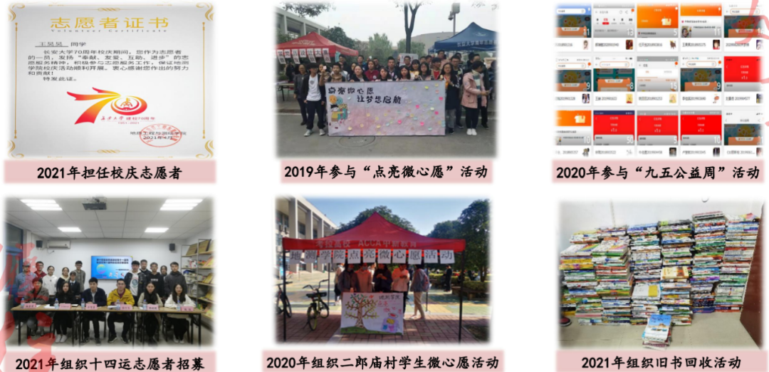 “优秀学子回母校”志愿服务活动,参与三次,带动3600多名同学,在1194所中学讲述长大故事,荣获优秀组织者称号2次。