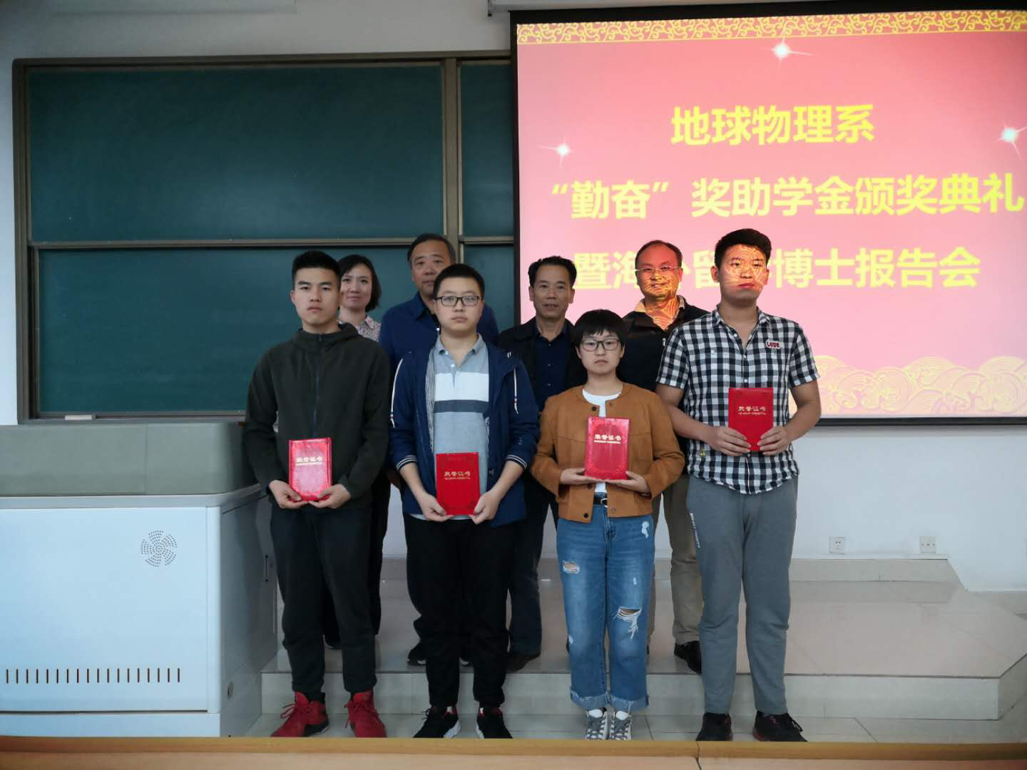 地球物理学科的关心和支持表示了衷心的感谢。随后,由杜福元书记、邵广周副院长、李貅教授、潘迎主任为获得“勤奋”奖助学金的徐家亮、勾宏康、伍鹏展和马静四位同学颁发获奖证书。