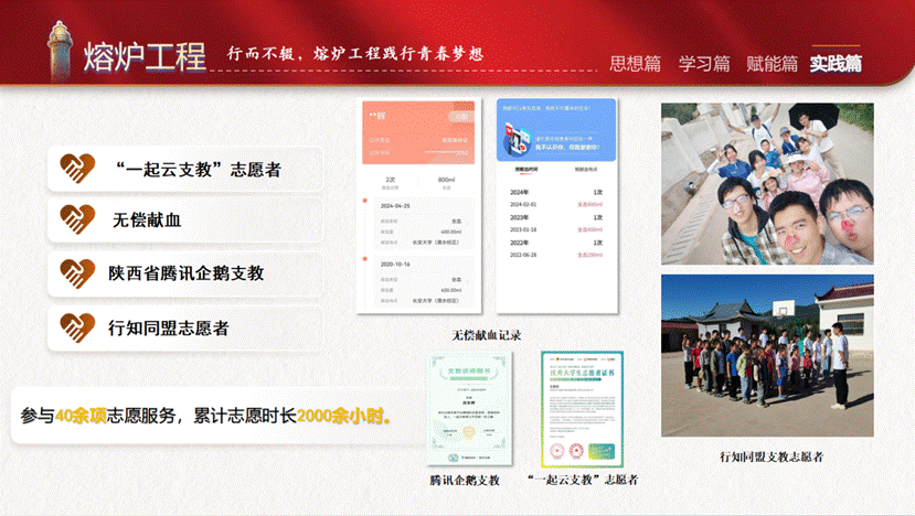 班级成员积极参与校园建设,班级成员中有25人曾加入各级学生组织,参与率达全院之首。全班共计参与40余项志愿服务,班级成员所参与志愿项目累计志愿服务时长2000余小时。大家在提升自身实践能力的同时扛起青年人的责任,激励更多同学积极参与志愿服务,以小我共筑青春之大我。
