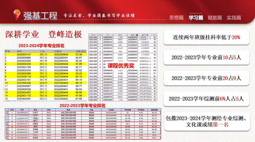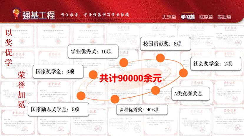 过去两年内,班级连续两年挂科率低于20%。在第一学年文化课成绩总排名中,专业前十班级占5人,专业前二十班级占9人。班级通过“前后帮扶”和“一对一精准辅导”的策略,让学习成绩较好的同学发挥引领作用,每位同学总体成绩均得到稳步提升。在这种“强基工程”的引领下,班级同学累计获得国家奖学金3项,国家励志奖学金5项,学业优秀奖16项,校园贡献奖8项,课程优秀奖40余项,共计奖学金金额超90000元。