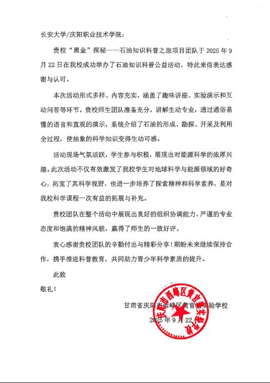 活动获得了积极反响,庆阳市西峰区黄官寨实验学校专门发来感谢信,对活动的组织成效与师生表现予以充分肯定。信中表示,本次活动“形式多样、内容充实、讲解生动专业”,使抽象的科学知识更易于理解,不仅激发了学生对地球科学与能源领域的兴趣,也有助于拓宽科学视野、培养探索精神与科学素养。来信特别提到,色情漫画