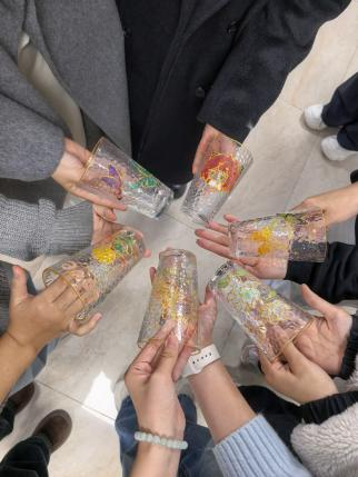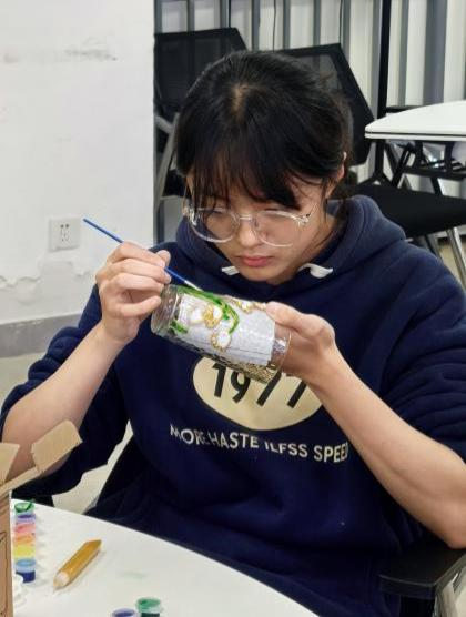 讲解环节结束后,便进入了沉浸式创作阶段。同学们纷纷拿起画笔,专注于方寸杯壁之间。现场气氛安静而专注,只见笔尖流转,色彩蔓延,透明无色的杯子逐渐被赋予个性与生命。无论是灵动的图案还是真挚的文字,都成为了同学们内心世界的独特注脚。