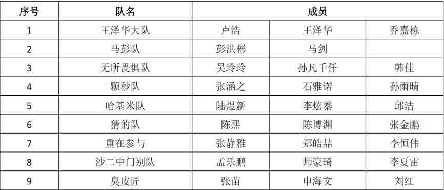 初赛于11月23日在鸿远一区WH1101、WH1102、WH1103教室举行,经评审,以下9支队伍脱颖而出,成功晋级决赛。