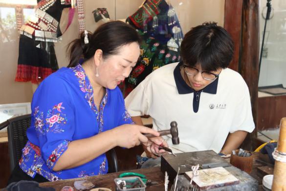实践队深入龙井村"一村百坊"非遗集群,系统调研传统技艺的现代转化路径。在刺梨酿酒坊,完整记录31道布依古法工艺,挖掘其待客文化的商品转化潜力;于辣坊重点调研"晒腌剁封"技艺与现代电商的融合模式,见证日销千单的实效;在国家级传承人张谨的银坊,考察锻刻技艺在当代审美下的创新应用;染坊内"民族团结主题长卷"的共创实践,则体现了多民族"技艺共传、产业共兴"的发展理念。