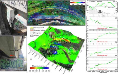 张勤教授研究团队与西班牙阿利坎特Roberto Tomás教授团队合作,利用合成孔径雷达干涉测量技术(InSAR),采用德国TerraSAR-X与西班牙PAZ雷达数据对西班牙Alcoy全市进行了地质灾害早期识别与动态监测,成功探测出41个地质灾害隐患点,结合现场调查划定了三个滑坡高风险区(图3),并对风险区采用InSAR技术进行了动态跟踪监测,最终成功捕获到异常形变现象(图4)。相关研究成果在滑坡发生前多次提交给Alcoy市政管理部门,有效指导该滑坡灾害的管理及防灾减灾工作,避免了人员伤亡与经济损失。