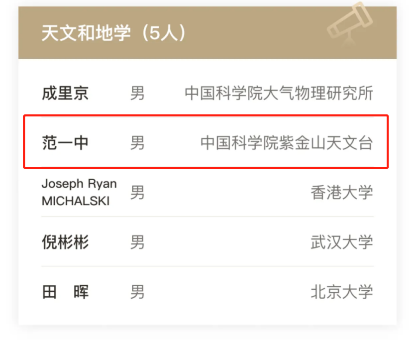 荣获2023年科学探索奖的48人遍布各大领域,含数学物理学6人,化学新材料5人,天文和地学5人,生命科学5人,医学科学5人,信息电子5人,能源环境6人,先进制造3人,交通建筑3人以及前沿交叉领域5人。范一中校友属于天文和地学领域获奖人员之一。