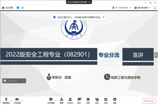安全工程系召开了2022级安全工程专业专业分流线上宣讲会。安全工程系副主任李凯玲、教师屈璐,以及安全工程系2022级本科生共计四十余人参加了会议。会议由李凯玲副教授主持。
