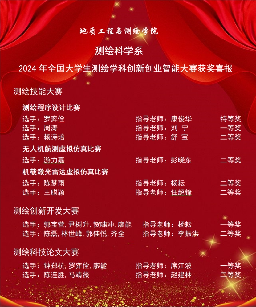 测绘学科以专业竞赛为驱动,扎实推行本科导师制与《测绘创新开放实践》教学改革,增强学生的创新创业意识,提升实践动手能力,达到以赛促学、以赛促教、以赛促改的人才培养目标。