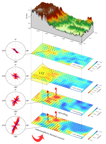 图3.松潘-甘孜东北部及邻区的地形、S波速度和方位各向异性结构的三维图。玫瑰图(左)显示了松潘-甘孜东北部的方位各向异性,红色箭头表示软流圈的活动。