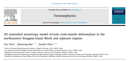 Chen, Y., Bao, Q., & Chen, X. (2026). 3D azimuthal anisotropy model reveals crust-mantle deformation in the northeastern Songpan-Ganzi Block and adjacent regions.Tectonophysics, 922, 231043.