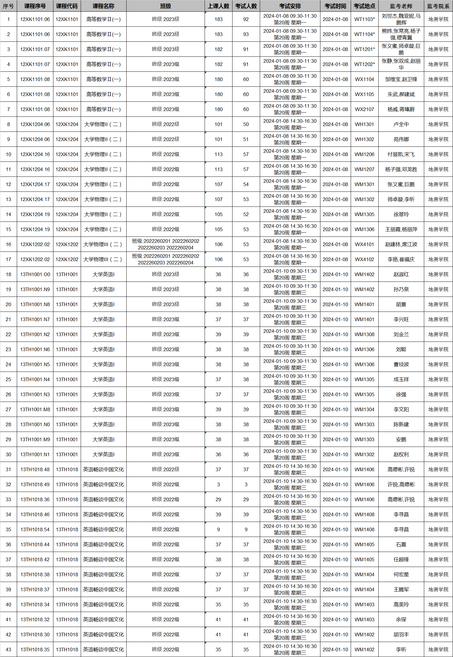 本学期高等数学、大学物理、英语类考试周期末考试监考安排已发布,监考安排学院已经在本科教务系统中填报完成(监考教师可同时在本科教务系统中查看监考安排)。为确保考试平稳顺利进行,学院已将相关监考工作安排表格上传到附件中,请各位老师及时下载查阅,并按时完成监考工作。